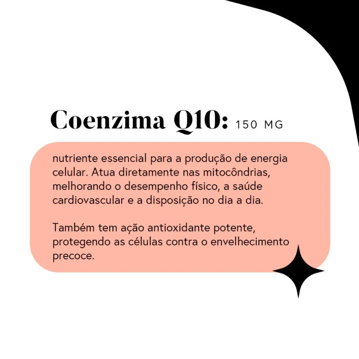 - Coenzima Q10 – 150 mg: Essencial para a produção de energia celular (ATP). Ajuda a manter o corpo mais ativo, melhora a disposição e protege contra o estresse oxidativo.
