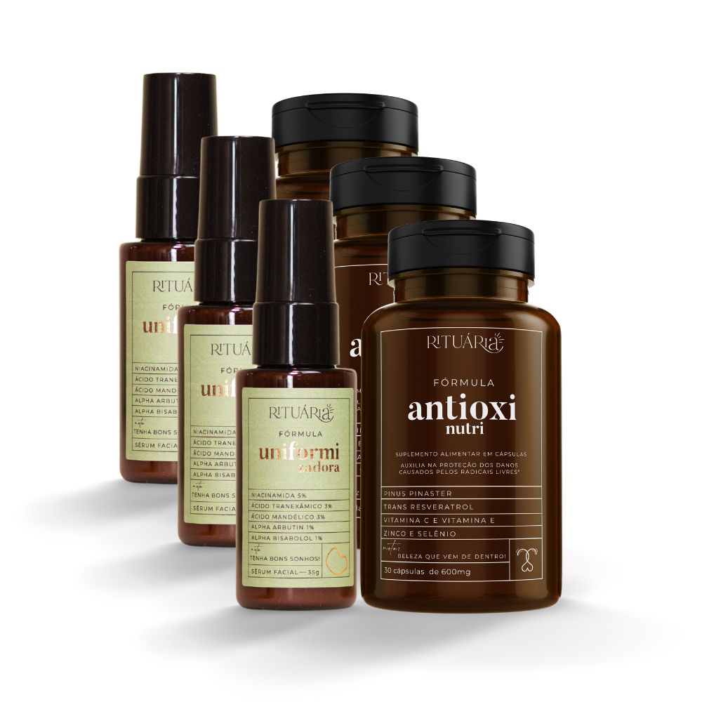 Apresentamos o Kit de Início Rápido da Rituária, uma combinação poderosa de 6 produtos que proporcionam um tratamento completo para manchas e melasma. Este kit inclui 3x Fórmulas Uniformizadora Anti-Manchas, um sérum desenvolvido por dermatologistas que oferece resultados de consultório no conforto de sua casa, e 3x Fórmulas Antioxi Nutri (30 cápsulas), um suplemento nutricional revolucionário que transforma a saúde e a aparência da pele.