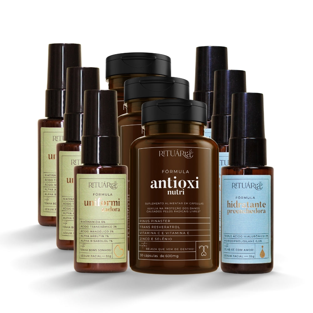 Apresentamos o Kit Avançado da Rituária, uma combinação completa de 9 produtos que proporcionam um tratamento abrangente para manchas, melasma e rejuvenescimento da pele. Este kit inclui 3x Fórmula Uniformizadora Anti-Manchas, um sérum desenvolvido por dermatologistas que oferece resultados de consultório no conforto de sua casa, 3x Fórmula Antioxi Nutri, um suplemento nutricional revolucionário que transforma a saúde e a aparência da pele, e 3x Fórmula Hidratante Preenchedora, um sérum poderoso que hidrata e preenche linhas finas, proporcionando uma pele visivelmente mais jovem e radiante.