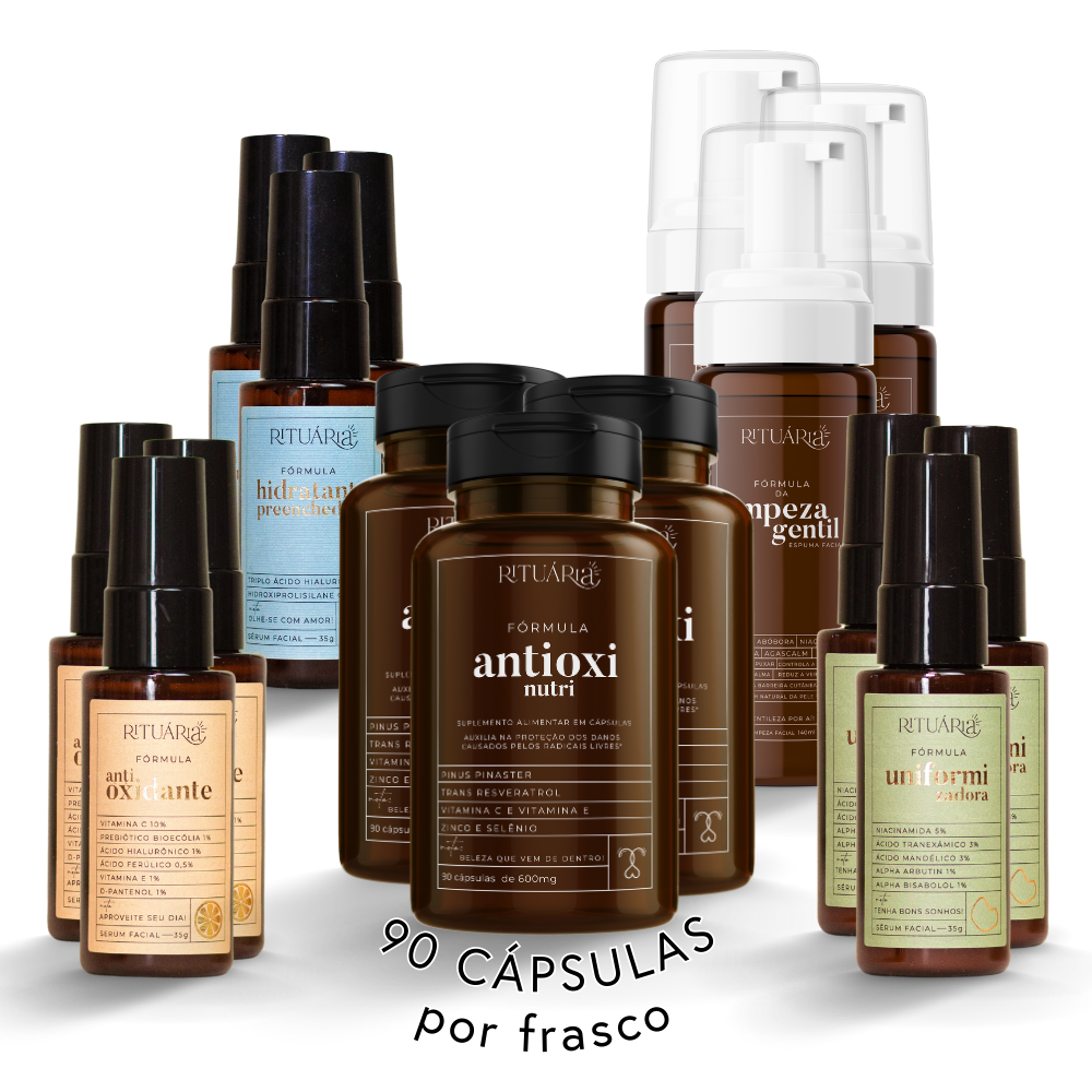 Apresentamos o Kit Premium 90 da Rituária, uma seleção completa de 15 produtos para um tratamento integral da pele. Este kit inclui 3x Fórmula Uniformizadora Anti-Manchas, 3x Fórmula Antioxi Nutri, 3x Fórmula Hidratante Preenchedora, 3x Fórmula Antioxidante e 3x Fórmula Limpeza Gentil. Com esses produtos, você terá uma rotina de cuidados que trata manchas, melasma, hidrata, protege contra danos solares e limpa suavemente a pele.