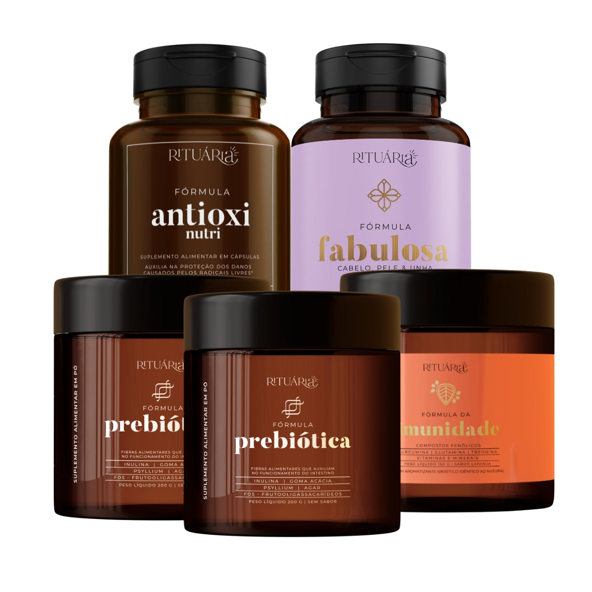 O Kit Suplementos Rituária foi pensado para mulheres que cuidam da beleza e da saúde de forma integrada. Uma seleção de fórmulas inovadoras que agem de dentro para fora e de fora para dentro, promovendo equilíbrio intestinal, fortalecimento da imunidade, nutrição celular e cuidado com a pele.