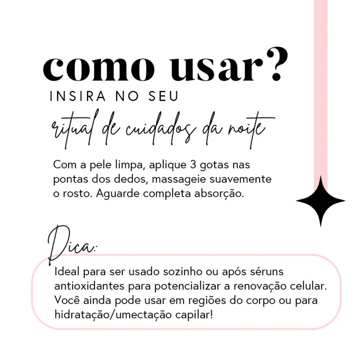 Modo de Uso: Aplique três gotas na sua pele no último passo do skincare noturno. Massageie suavemente e aguarde 5 minutinhos para que a pele absorva tudo. Use regularmente para resultados incríveis.